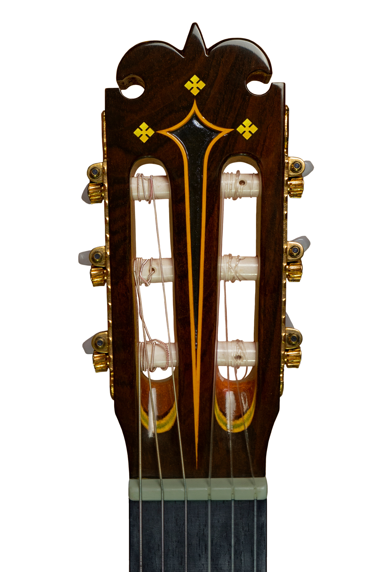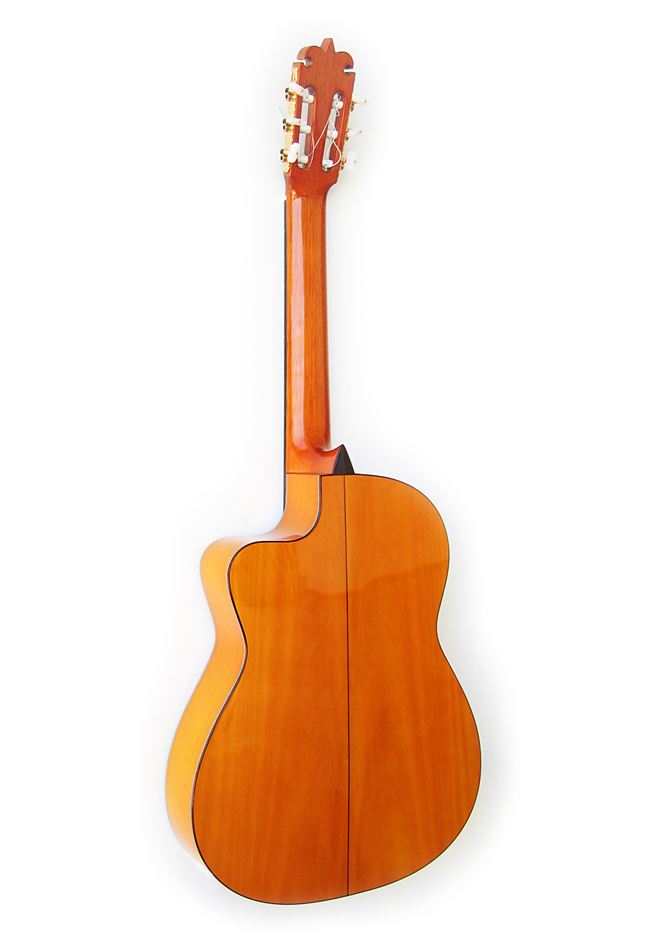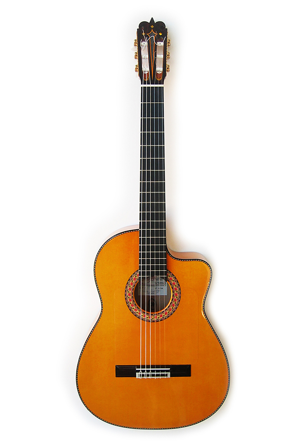 Flamenco guitar with a German spruce top, Spanish cypress back and sides, Cameroonian ebony fingerboard, and a reinforced Honduran cedar neck.
